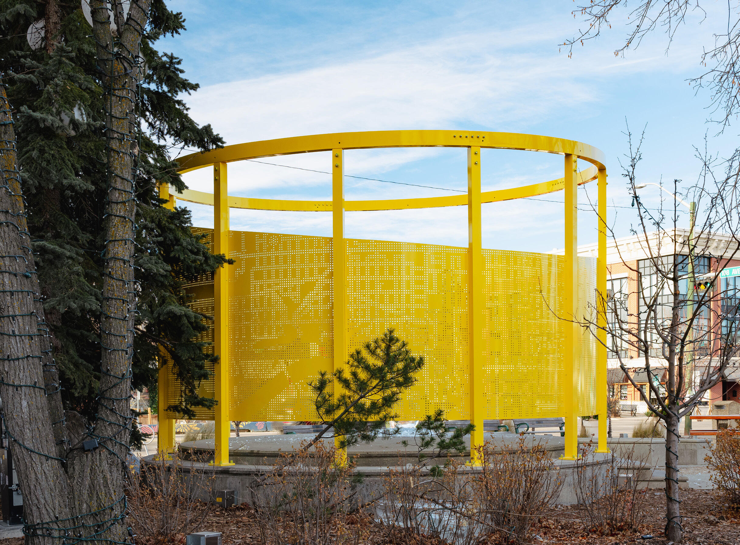 Located on 124th Street in Edmonton, the Helen Nolan Pavilion is a permanent shade structure that brings life and vibrancy to a well-loved and highly used park. Year-round, Helen Nolan Park features festivals, markets, and various performances. It utilizes perforated aluminum walls to block low, evening sun to the West and cool winds to the East. During the summer months, a shade sail is erected to protect performers from rain and heat.