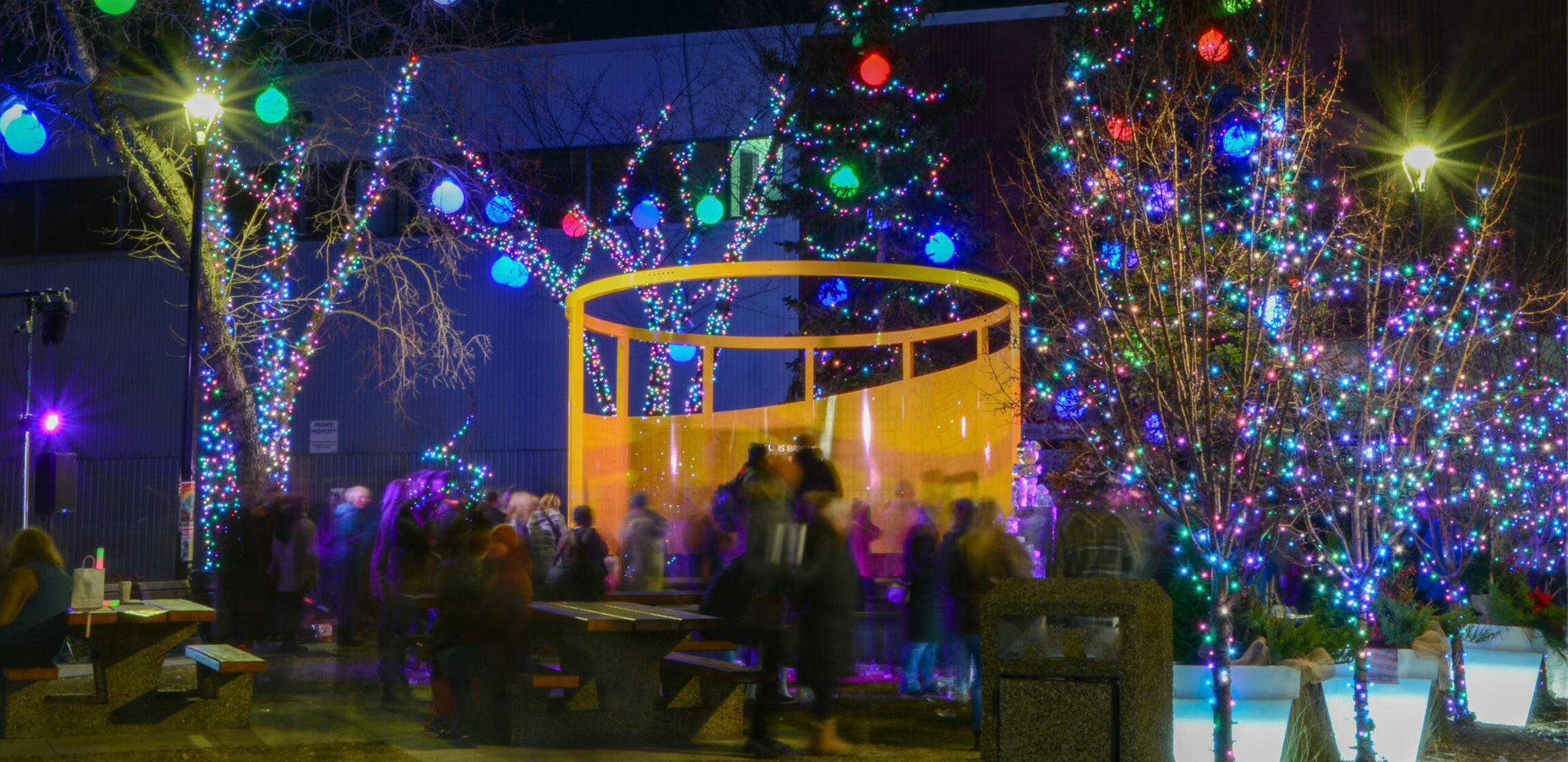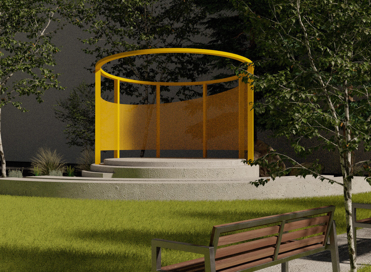 Located on 124th Street in Edmonton, the Helen Nolan Pavilion is a permanent shade structure that brings life and vibrancy to a well-loved and highly used park. Year-round, Helen Nolan Park features festivals, markets, and various performances. It utilizes perforated aluminum walls to block low, evening sun to the West and cool winds to the East. During the summer months, a shade sail is erected to protect performers from rain and heat.